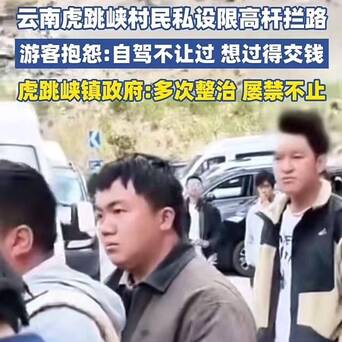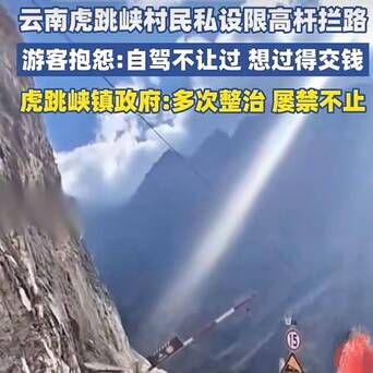 【云南虎跳峡乱象频发!村民私设路障拦路收费,肆丧胆怯坐地起价】念念钱念念疯了!不少旅客反馈,虎跳峡村民私设限高杆拦路,念念要通过就得交钱!旅客诉苦:村民有什么职权设卡收钱?当地修起:屡次整治,屡禁不啻。网友:什么叫屡禁不啻?刑事拘留,下狱5年起,看谁敢!