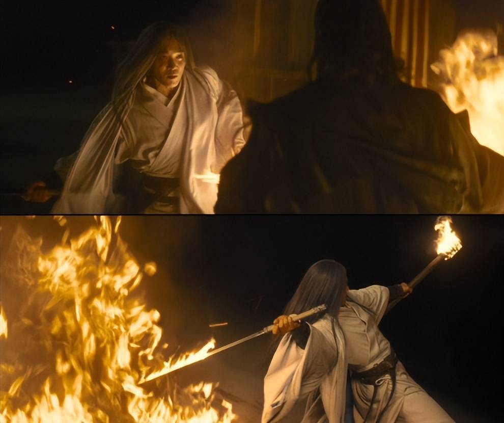 为了这场戏,剧组远赴新疆大漠铺设油线,使用汽油与煤油羼杂燃料模拟火油成果,这种真实火焰带来的灼热感,远不是CG殊遵循比较的。