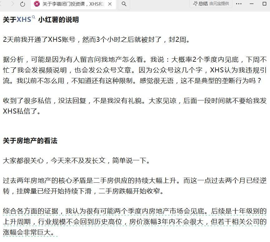 当天午后,半夏投资首创东说念主李蓓在微信公众号发文,就其在小红书(XHS)账号运营及房地产不雅点作出进一步说明。文中说起的小红书账号特别事件及中枢阛阓判断激发温暖。